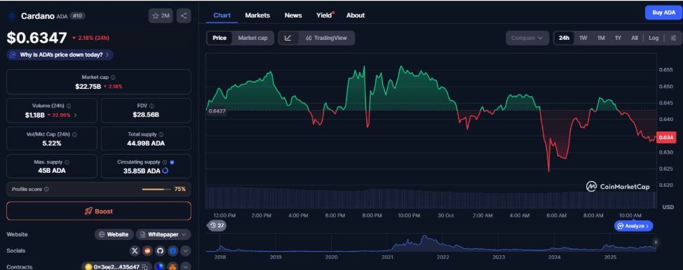 Currently priced around $0.6347, ADA has slipped 2.18% in the past 24 hours, signaling a cautious mood across the broader market.