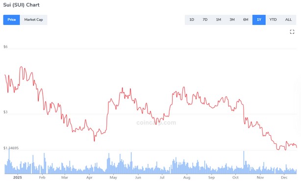 As of mid December 2025, SUI trades around $1.50. The coin hit an all-time high near $5.35 in January, then dropped hard. Over the last month it fell around 20%, had about half its days in the green, and trades in a market that sits on the edge of extreme fear on the Crypto Fear & Greed Index.