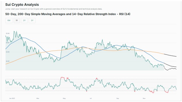 From a price structure view, CoinCheckup highlights support near $1.41–$1.25 and resistance around $1.57–$1.72. It reinforces the idea that SUI is currently range-bound rather than in a clear trend.