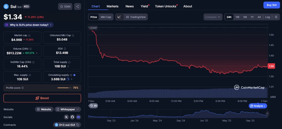 The market continues to search for direction and Sui price prediction as the coin trades at $1.34, holding a key support range after its recent rally cooled.
