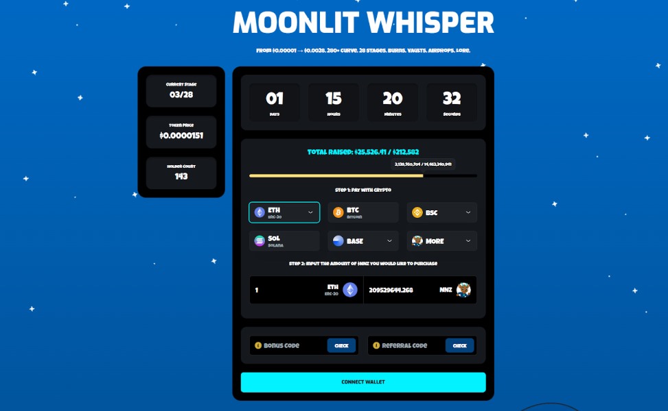 The presale allocates supply through 28 tiered stages, starting with 12.7B $NNZ per phase and shrinking to 300M $NNZ in the final stages, with all unsold tokens permanently burned. This tightening supply curve creates rising scarcity as the presale progresses.
