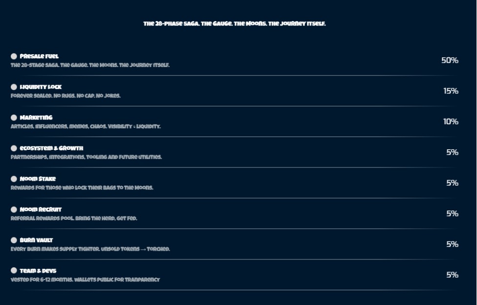 The Noom Gauge tracks holders, funds raised, remaining supply, and burn events in real time. There are no hidden wallets or unexplained emissions.