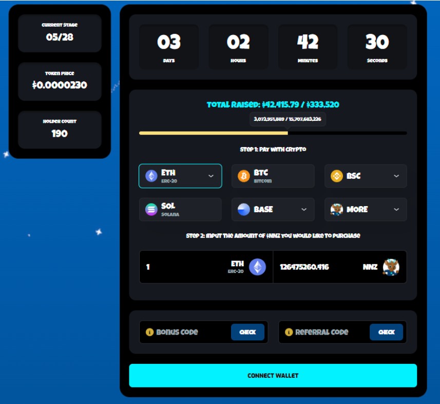 Noomez accepts more than 20 major networks and tokens, including Ethereum, BNB, Solana, Dogecoin, XRP, Polygon, and more.
