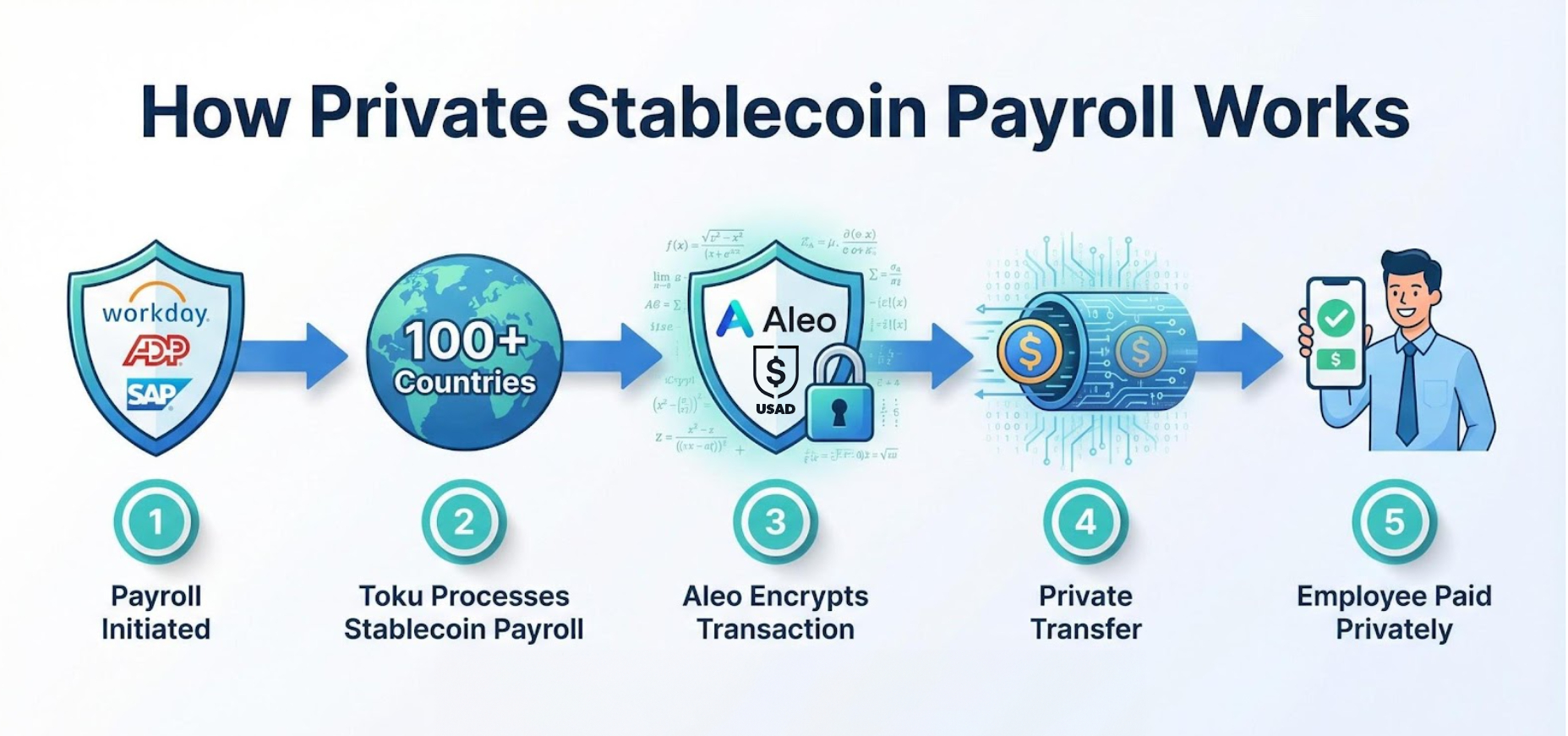 Toku's global payroll platform will now run on Aleo's privacy infrastructure. This integration enables enterprises to pay employees and contractors using stablecoins, such as the Aleo ecosystem's USAD issued by Paxos Labs and backed 1:1 by Paxos Trust Company's regulated stablecoin, USDG. Crucially, all transactions remain confidential, shielded from public view.