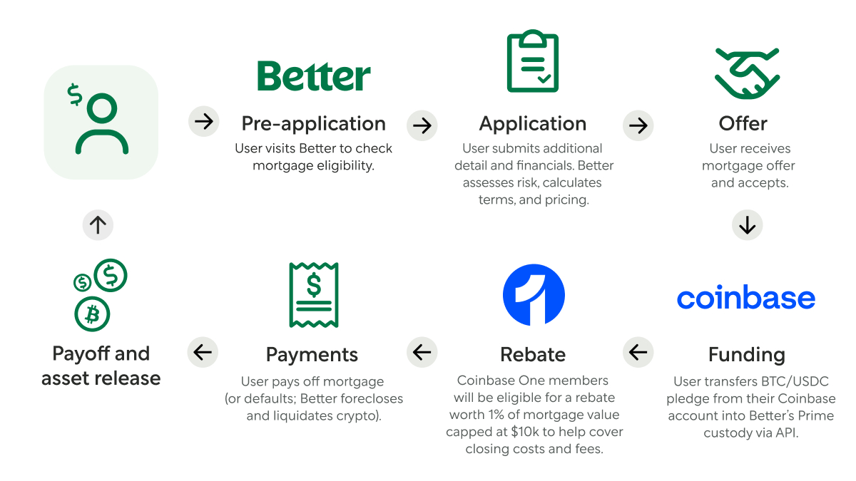 - Unlike traditional securities backed loans for downpayment, usually provided by private banks to their best clients, due to the unique architecture of Coinbase Custody, consumers will be able to pledge certain quantities and certain types of tokens, rather than having to pledge the entire value of their account. Better and Coinbase intend to partner to expand the digital assets eligible for the product over time, expanding it to tokenized equities, fixed income and other tokenized real estate assets.
