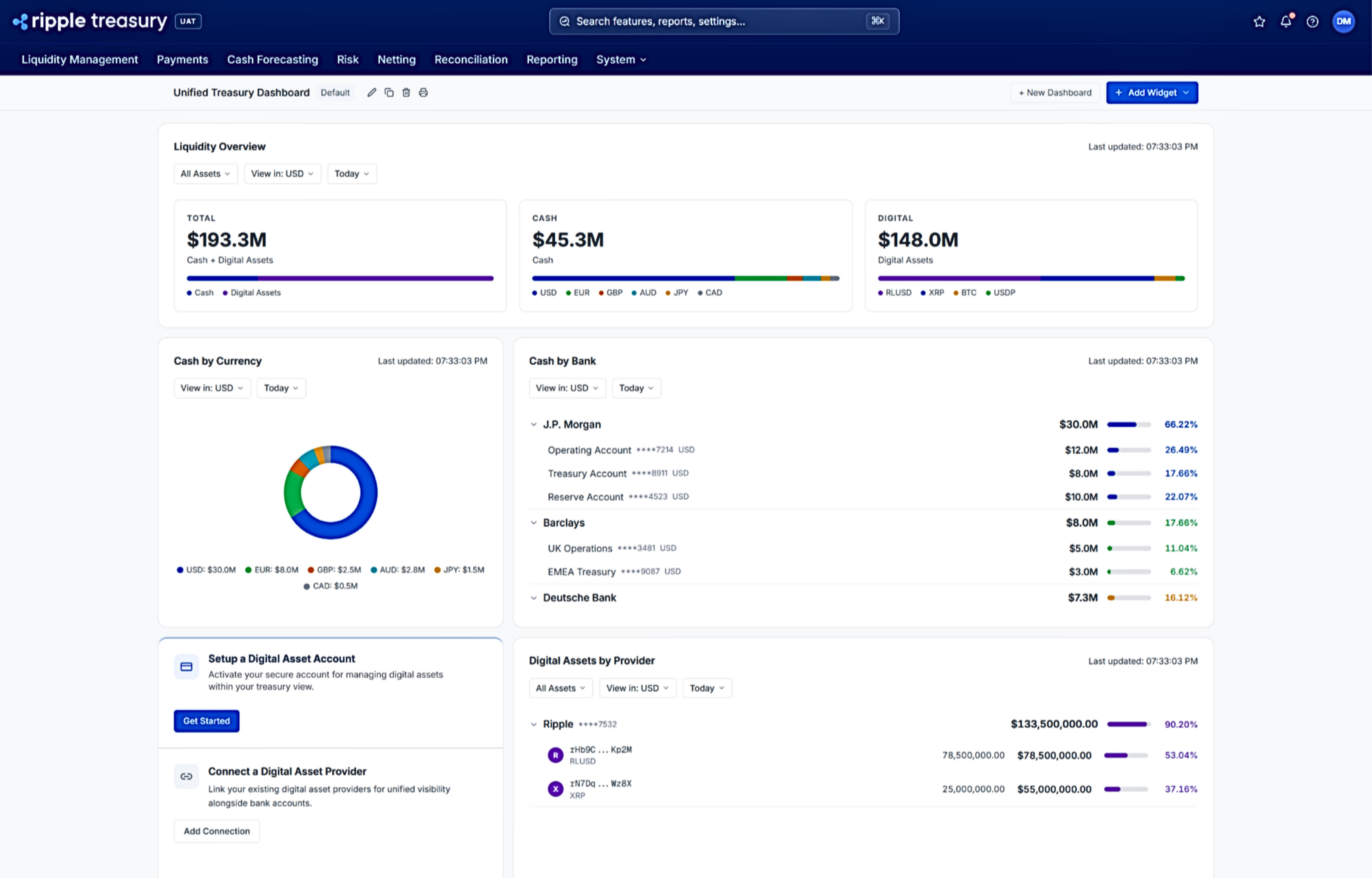 SAN FRANCISCO--(BUSINESS WIRE)--Ripple, a provider of blockchain-based enterprise solutions across traditional and digital finance, today announced the launch of Digital Asset Accounts and Unified Treasury within Ripple Treasury – the first native digital asset capabilities embedded directly into a treasury management system. CFOs and their treasury teams can now view, hold, receive and manage fiat and digital liquidity held within their bank and custody providers in a single system – eliminating separate platforms, reconciliation workflows, and manual consolidation. No other treasury management system offers this, marking a decisive competitive milestone for both Ripple Treasury and its customers.