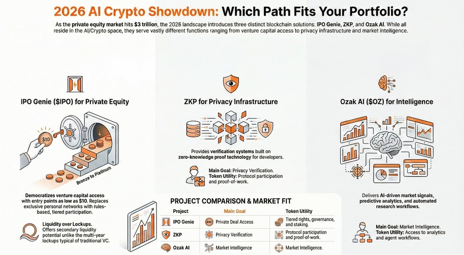 This comparison covers IPO Genie ($IPO), ZKP, and Ozak AI. It focuses on tokenized investing, private market access for retail investors, and how IPO Genie compares to VC, with practical detail and calm decision logic.