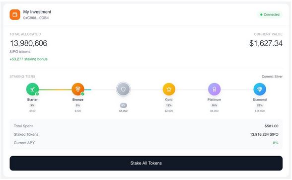 • Earn extra tokens by holding $IPO up to 20% for staking bonus (see the tier screenshot below)