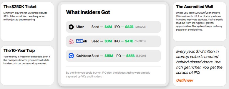 Traditional venture capital favors insiders, high minimums, long lockups, and opaque processes, leaving most investors excluded.