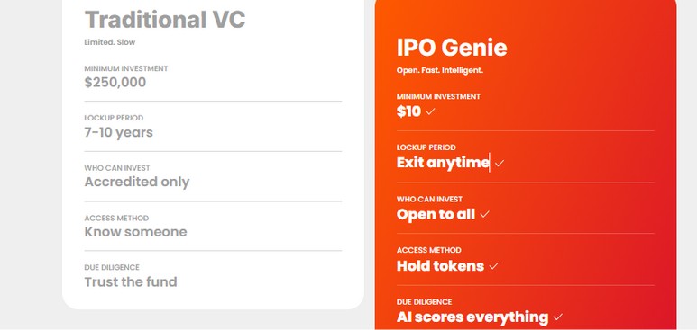 IPO Genie changes this with blockchain transparency: every transaction and ownership share is visible, distributions are automated with smart contracts, and multi-signature wallets plus third-party custody reduce risk. Traditional VC simply can’t offer this level of clarity and control.