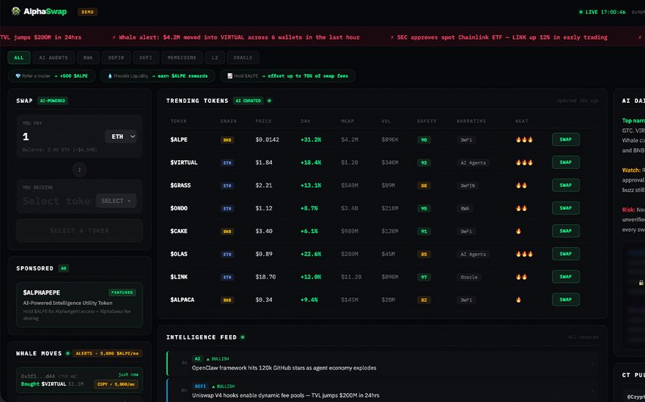 AlphaSwap, the project’s cross-chain AI DEX, is not a feature in development. It is a functioning exchange routing real trades across chains and generating real fee revenue today, while Stage 13 sits open at $0.01494.