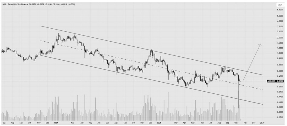 ARB is consolidating inside a descending channel on the 3D chart after dropping from $0.4250 to $0.1920 in the October 11 washout. Now near $0.3288, traders await confirmation as the weekly DEX volume of 9.5 billion shows steady use.