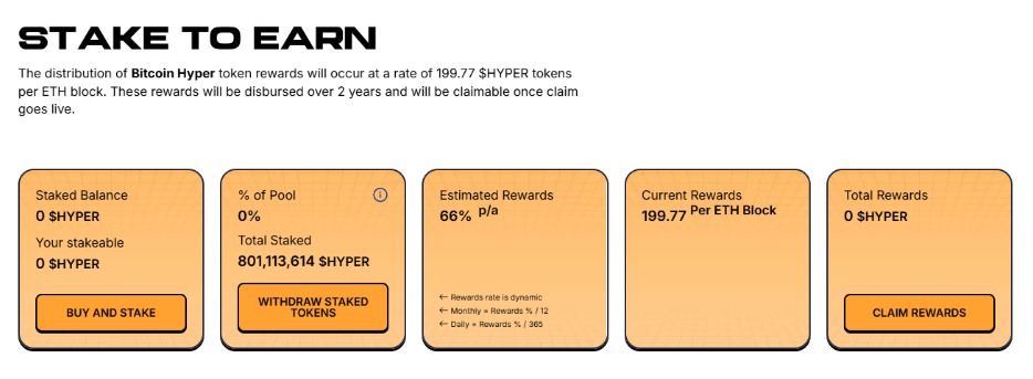 $HYPER holders can also stake their tokens and earn passive income. Namely, the current reward APY is 65%. The rewards will be distributed over two years and will be claimable after the claim goes live. Mark your calendars: the Bitcoin Hyper launch date is probably approaching, promising new staking and rewards opportunities. Don’t wait; explore the presale now.