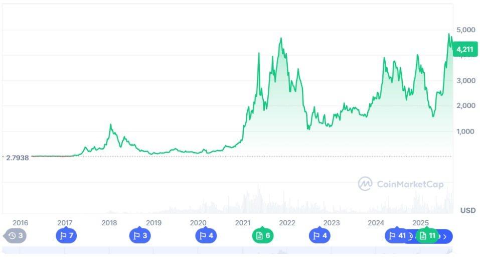 Ethereum’s price is standing at $4,211. On a weekly level, the price has dropped by 6.96%. The decrease is even more notable within the last month (-11.71%). When looking at its all-time high, reached a month ago, ETH is currently down by 15.07%.