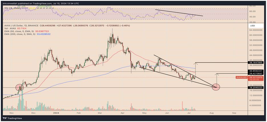 Analysts believe Avalanche (AVAX) will experience a 40% price increase to $38 before September. They say this will be possible if the cryptocurrency breaks past its support level. According to these projections, if the price of Avalanche (AVAX) rises but its daily RSI fails to surpass its descending resistance line, its price may dip below the wedge range.