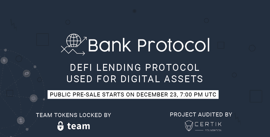 Bank Protocol announces its only public pre-sale. The public pre-sale will start on December 23, 7:00PM UTC and will be available on our website. 240,000 tokens will be sold for 2.5 USD per token (0,00397 ETH — Fixed Ether price: $630), accepted currency is Ethereum. (Minimum buy-in of 0.5 ETH and a maximum of 25 ETH per address)