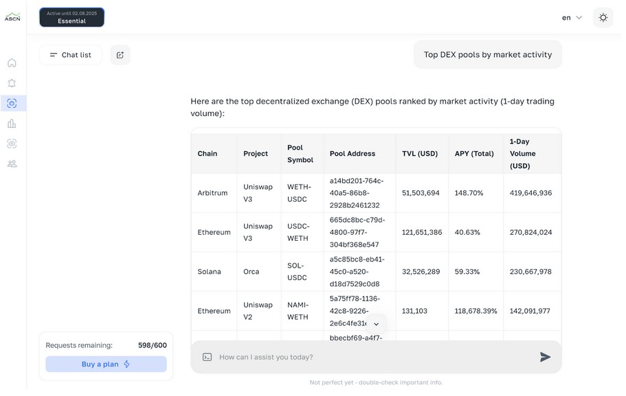 For instance, when asked “Top DEX pools by market activity,” ASCN instantly generates a detailed table and explains how to use the data to profit.