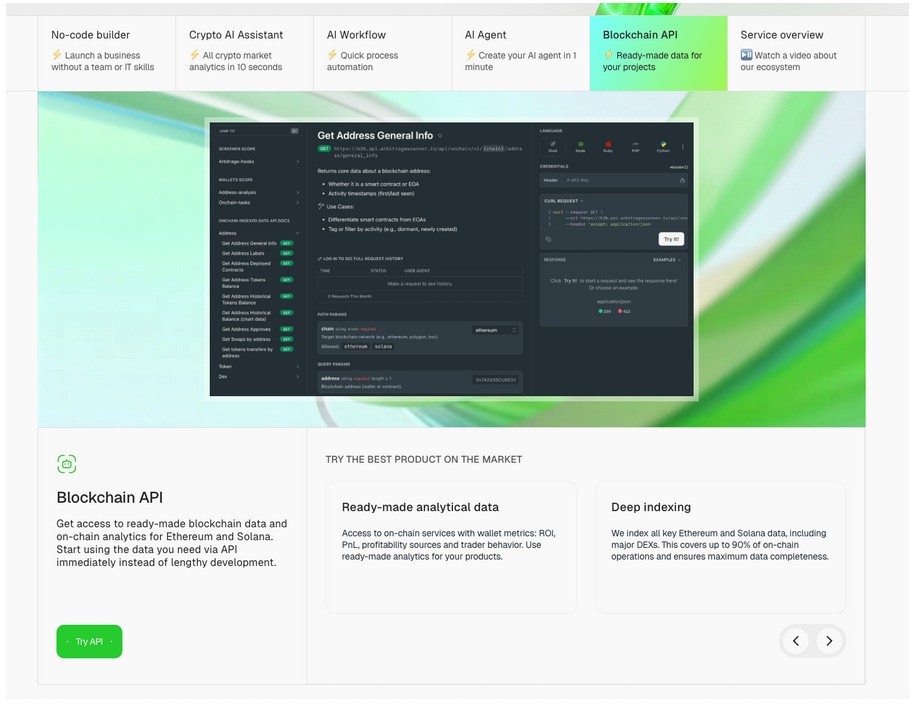 The platform includes a no-code builder that allows users to create custom bots and analytics tools without programming knowledge. Simply describe the task in chat — the AI generates a ready-made solution, whether it’s a token report, transaction scanner, or fund monitoring tool.