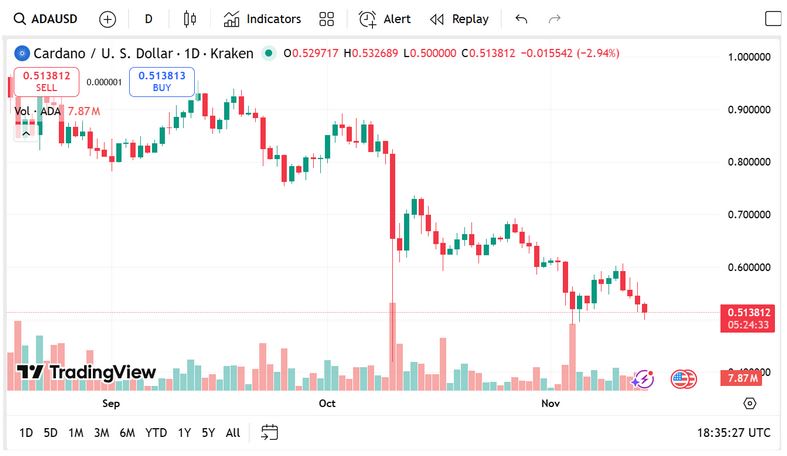 Cardano is currently selling at $0.5138 following a significant drop of about 2.54%, with a market capitalization of $18.4 billion. Trading volume has increased 51.88% to $1.3 billion, indicating active repositioning across centralized exchanges.