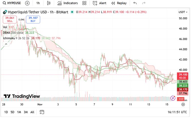 Hyperliquid is trading at $39.17, showing a 4.2% daily increase. Its total valuation now stands at around $13.17 billion, and volume has reached $335.98 million, although activity has decreased by 44.71%.