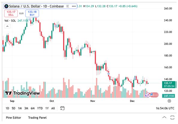 Solana is selling at $133.17, up marginally on the day as broader activity continues to decelerate. The network market capitalization stands at $74.83 billion, but daily trading volume has fallen sharply to $2.87 billion – more than a 50% decline.