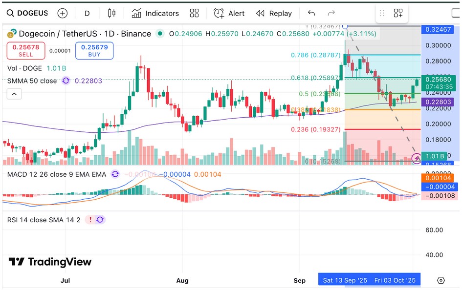According to technical analysis, the Dogecoin price is on a bullish rally. The memecoin trails above its 50-day SMA value of $0.22. Currently, the asset has hit a resistance at the 61.8% Fibonacci retracement value of $0.25.