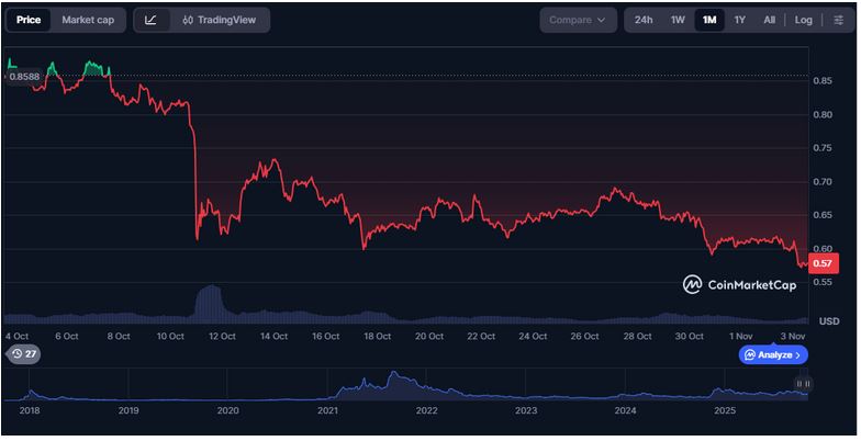 Currently trading at $0.5775, Cardano’s hopes of regaining its bullish momentum are slowly disappearing. The latest price drop has shaved another $2 billion off its market cap, bringing it to $20.7 billion. Compared to just 25 days ago, Cardano has lost nearly a third of its value, signaling that investors are dumping tokens en masse and moving on to other projects with a better short-term outlook.