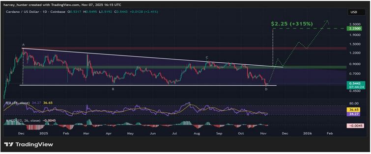 As of November 14, ADA is trading around $0.52. I checked this morning and thought, Wow, ADA really held its ground despite the slow market over the past few weeks. It is not running yet, but the chart is starting to show something interesting. When you look closely at ADA’s chart, you can see this rounded shape forming. Traders refer to it as a rounded bottom, which typically indicates that buyers are gaining strength. The candles are starting to show more green than red and the volume is becoming steadier. Momentum indicators also appear to be improving.