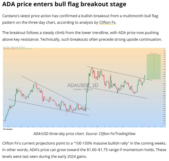 Cardano is generating buzz again. According to recent analyst coverage, ADA is showing bullish chart signals and could be aiming for a 100–150 % rally if the current momentum holds. While that’s strong, it’s far from a 10x scenario—and the broader narrative suggests ADA may be approaching its ceiling rather than breaking it. On-chain data shows significant accumulation of ADA that’s been static for over a year, which hints at conviction but not necessarily new entry momentum.