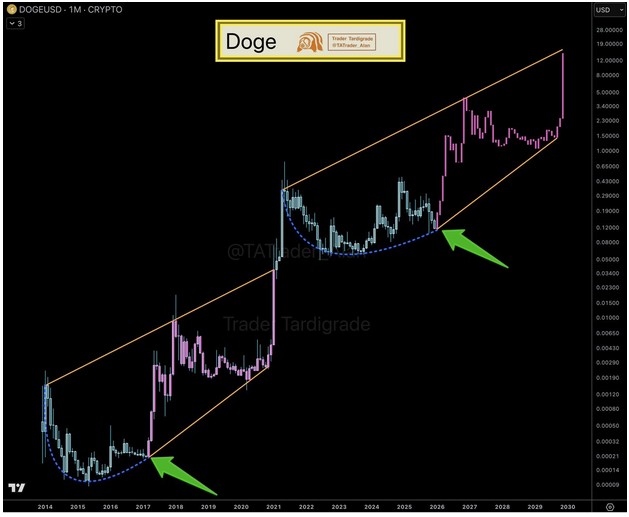 Analyst projections based on the channel pattern suggest that, if the current cycle repeats, DOGE could potentially revisit the mid-range between $0.20 and $0.25 in the medium term. The upper boundary of the macro channel projects a long-term target between $0.80 and $1.20, though price historically takes months of sideways action before breakout phases begin.