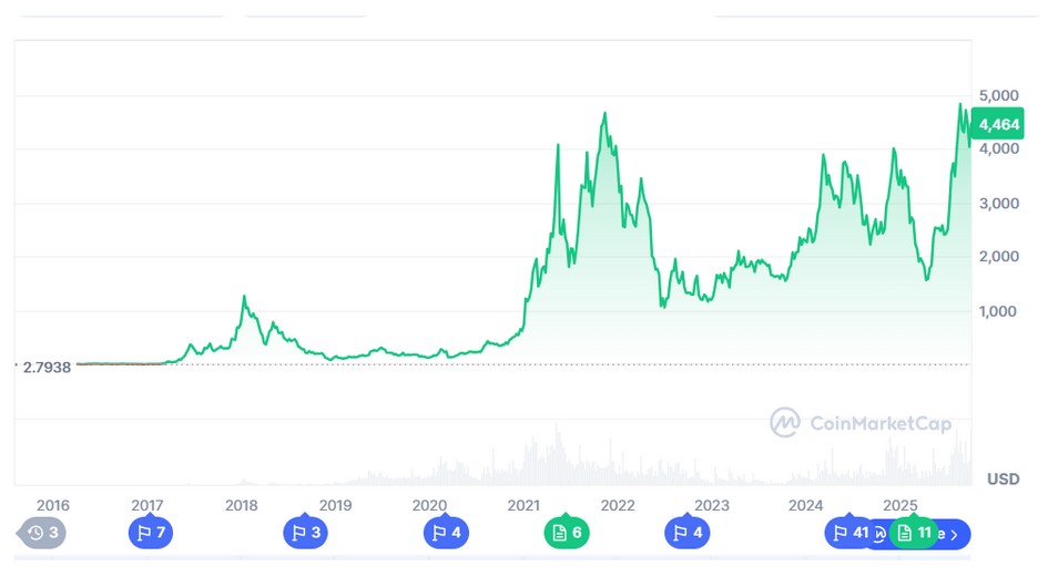 ETH price could hit new all-time highs of over $10K next year, due to renewed institutional demand through treasury companies and Ethereum ETFs. Currently, $ETH is worth $4,464, up 1.4% in the past 24 hours, and 3.6% in the past month.
