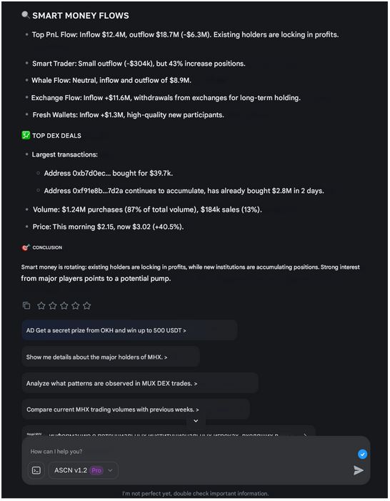As a result, the AI assistant showed me which tokens had seen growth in volume and accumulation from smart wallets, as well as the absence of mass deposits on CEX. Thus, I found a token that whales had already noticed, but which mass investors had not yet seen, as there had been no positive news about the project. However, a regular ChatGPT or Grok would have given something generic like “there was no positive news about the project” or “I don’t have any data to analyze.” Therefore, the main trick is to find an AI that has access to blockchain data. And I found it — it’s ASCN.AI.