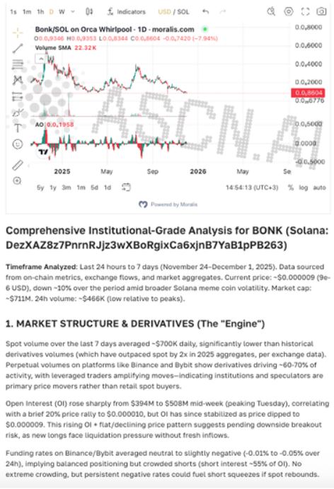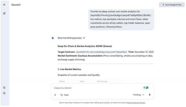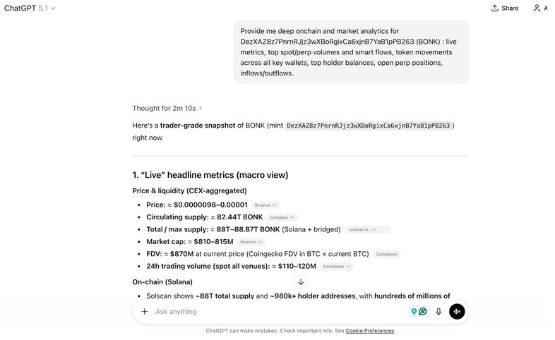 For the second example, I asked the question “Provide me with deep on-chain and market analytics for DezXAZ8z7PnrnRJjz3wXBoRgixCa6xjnB7YaB1pPB263 (BONK): live metrics, top spot/perp volumes and smart flows, token movements across all key wallets, top holder balances, open perp positions, inflows/outflows.”