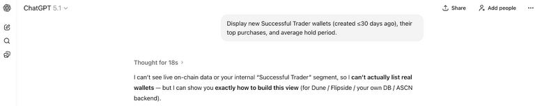 Let me tell you about another case. I was looking for a successful trader to start copy trading. I asked ChatGPT, “Display new Successful Trader wallets (created ≤30 days ago), their top purchases, and average hold period.”
