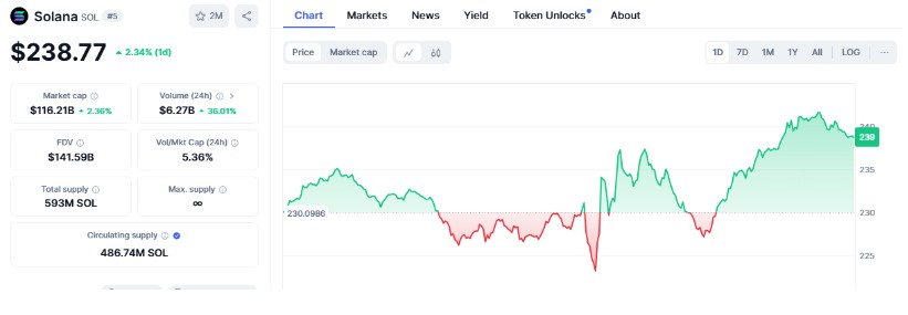 The situation now is that SOL is priced at $238.77, and the price has gone down by 2.34% in the last 24 hours.