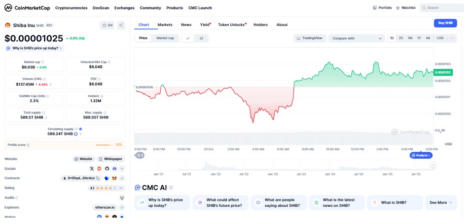 Shiba Inu is currently trading at approximately $0.000010 USD, indicating that its price has decreased by about 40–42 per cent in the year-to-date. Its movement is insignificant compared to bigger cryptocurrencies even with a minor recovery in the past 24 hours. The token is finding it difficult to sustain the elevated proceeds of the past years, making it uncertain whether a new 100x soar is in sight.