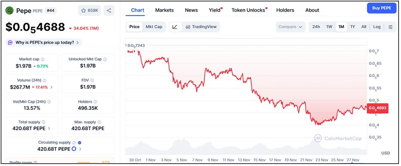 Pepe is once again becoming one of the most talked-about meme coins in the market as traders position for what many believe could be a major breakout year in 2025. With meme-coin liquidity rising, social sentiment turning bullish, and speculative appetite returning across the market, PEPE is showing early signs of a renewed surge.