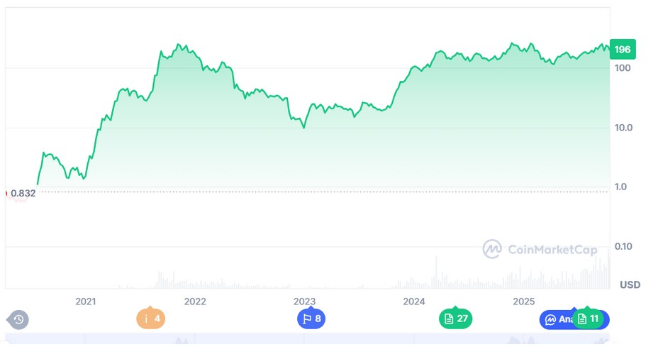 Solana is currently trading for $196.89. Its 24-hour volume stands at $13.36B, up by 15.57%. Compared to its all-time low, recorded five years ago, the coin is up by 38750.86%.