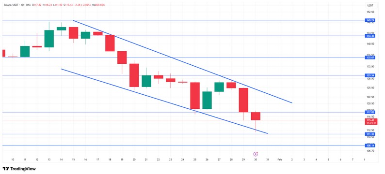 The latest in the Solana news is that SOL is changing hands at $115 at the time of writing after the market correction today. SOL remains above the $111 support level while consolidating within a descending wedge. This pattern is generally interpreted as bullish. Maintaining support keeps the upside scenario valid for now.