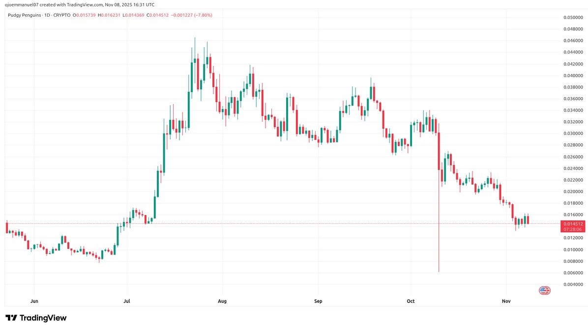 Now that the bridge between blockchain and mainstream culture has been established, Pudgy Penguins (PENGU) combines the popularity of NFTs with strong real-world branding. PENGU is trading in the $0.022 range, indicating a favorable cup-and-handle pattern that typically signals a good breakout. The $0.045 resistance is the largest, and market analysts hope to overcome it, aiming to reach $0.08 or higher.