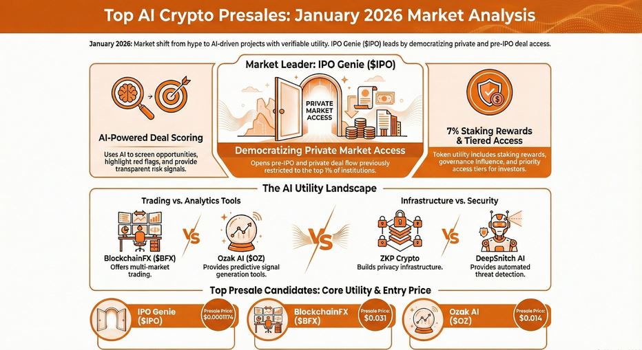That search is exactly what this guide answers. It compares the top 5 January 2026 presales using the criteria that usually decide winners early: what the product actually does, how the token fits into that product, and what signals suggest real traction. Along the way, it explains why IPO Genie ($IPO) is drawing attention for its private-market angle. While still giving a fair look at other AI-focused contenders and the risks that come with any presale.