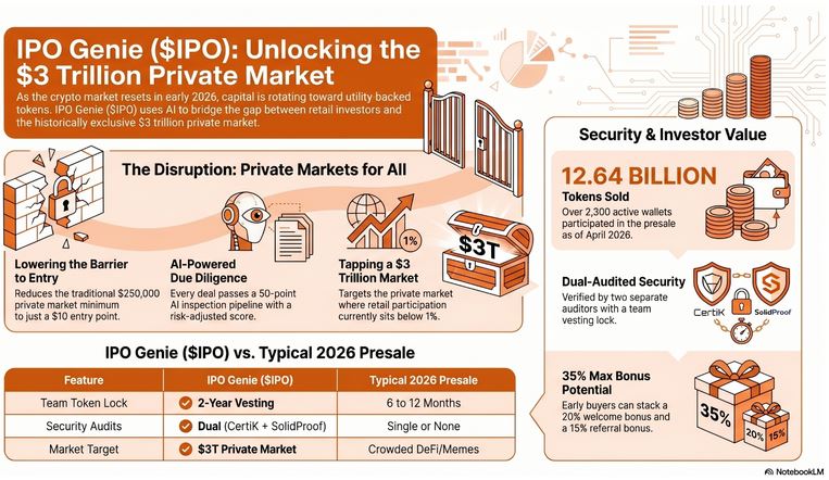 - IPO Genie ($IPO) is an AI-powered crypto presale targeting the $3 trillion private market where retail access sits below 1%.
