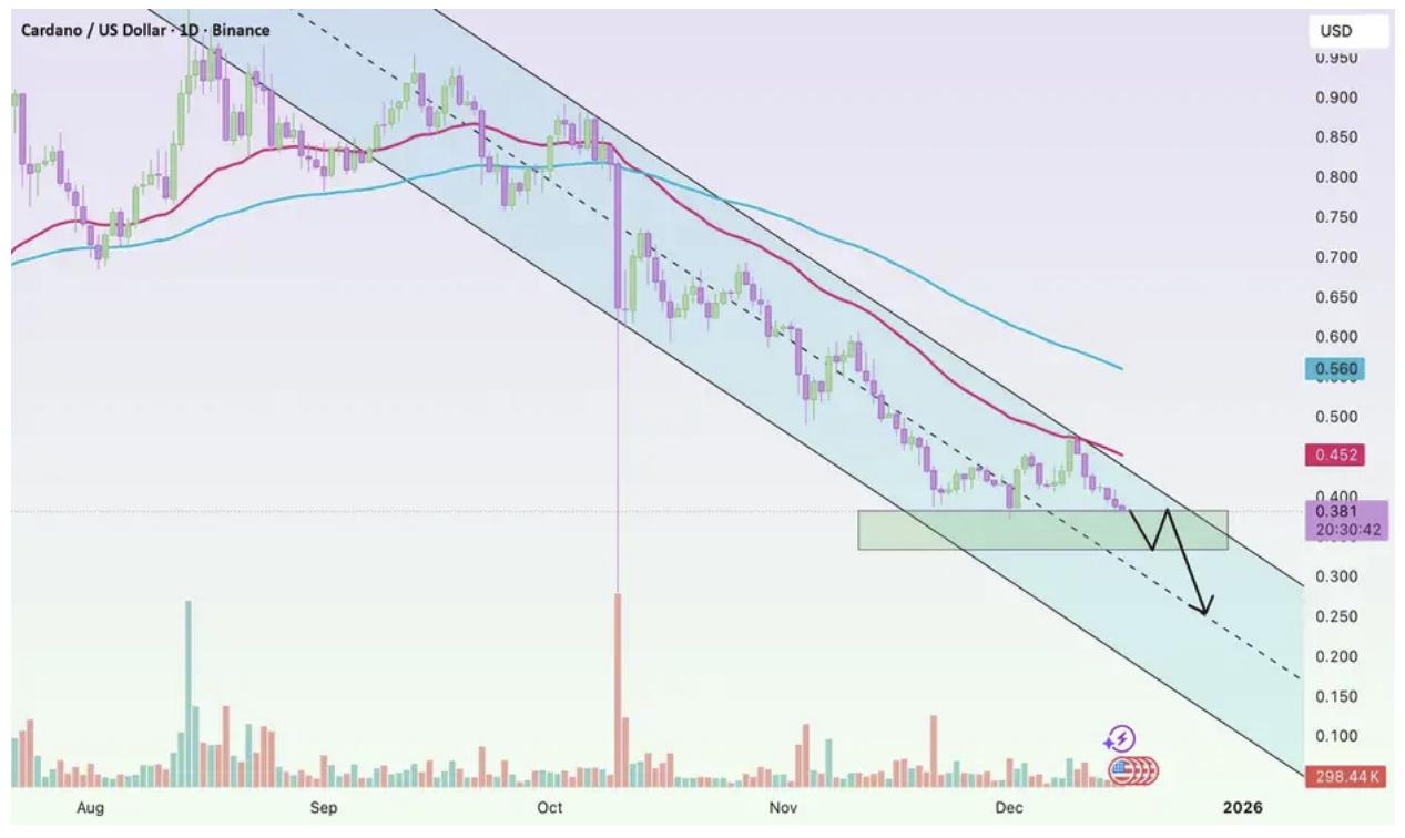 Cardano remains in a firmly bearish structure, with a clear sequence of lower highs and lower lows since October. Price continues to trade below the downward-sloping EMA34 and EMA89, confirming seller control. Recent rebounds have been weak and repeatedly rejected near 0.45. With fading volume and fragile candle structure around 0.37–0.39 support, the risk of a breakdown remains high, exposing ADA to a potential slide toward the 0.30–0.33 demand zone.