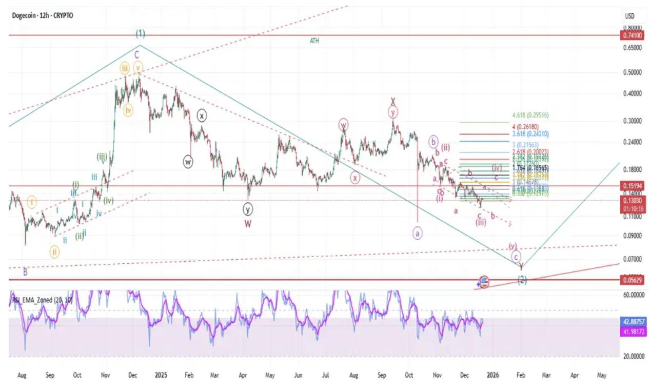 Dogecoin’s structure suggests an expanding ending diagonal completing wave C of a broader corrective phase. Near term, price may move sideways to slightly lower as wave b of wave 4 develops, followed by a relief rally to complete wave c of wave 4, potentially pushing above 0.15. However, the larger bias remains bearish, with another multi-wave decline expected afterward. A move above 0.187 would invalidate this setup, signaling a different corrective structure rather than a trend reversal.