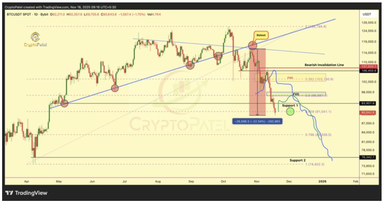 Bitcoin (BTC) has now fallen below the $90,000 level, a price not seen since April 22, 2025, marking roughly a 22% decline from the $115K rejection zone earlier this year. Technical analysis shows that BTC is following its mapped structure with precision, currently sitting near the 0.618 Fibonacci retracement, a high-probability bounce zone that could trigger a short-term relief move into the $98K–$100K region.