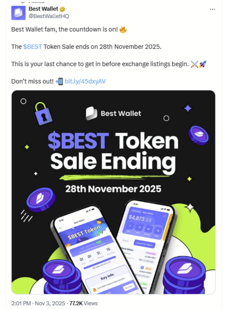 This presale crypto list 2025 concludes with Best Wallet Token, the crypto powering Best Wallet, the project with a growing base of 250K+ active users. As it features continuous product development, it’s clear that $BEST has an organic and real demand to sustain its long-term value.