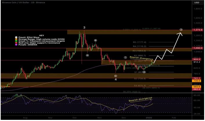 Looking ahead to 2026, BNB is expected to remain a major large-cap asset, but its growth curve naturally moderates as size increases. Technically speaking, BNB has closed above the daily 200EMA and the daily pivot, signaling a potential shift into a new bullish trend. Technical structure suggests wave 4 has completed after a clean ABC correction at high-volume support, opening the door for a strong wave 3 move toward all-time highs. While daily RSI shows bearish divergence, a break above wave 1 would invalidate it. The bullish outlook holds unless price drops below wave 2, the daily pivot, or the 200EMA.