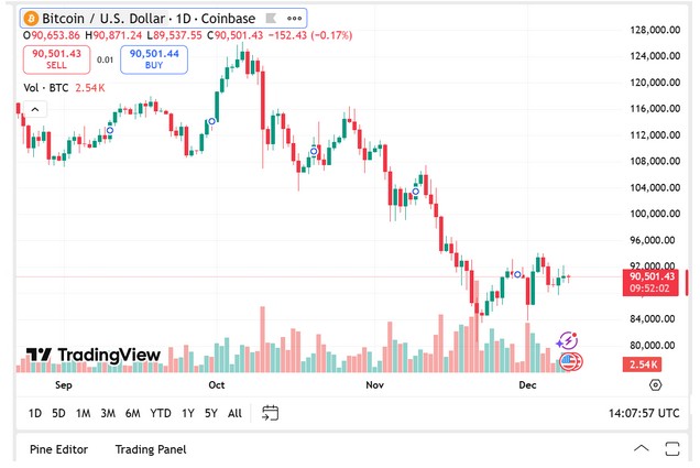 The mild 1.14 percent daily pullback sees Bitcoin change hands at $90,501.43 as it retains a market capitalization close to $1.8 trillion, hence becoming an anchor in the cryptocurrency market. It had a daily trading volume of $56.22 billion, indicating continued participation, albeit with a minor short-term slowdown.