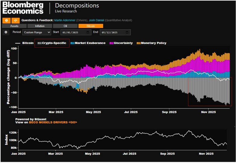 New analysis highlights that recent Bitcoin weakness has not followed macro deterioration. According to this Bloomberg economics based Bitcoin review, pressure has come from long term holder distribution, legal uncertainty, and internal industry issues. These factors shifted positioning even as macro signals stayed supportive.